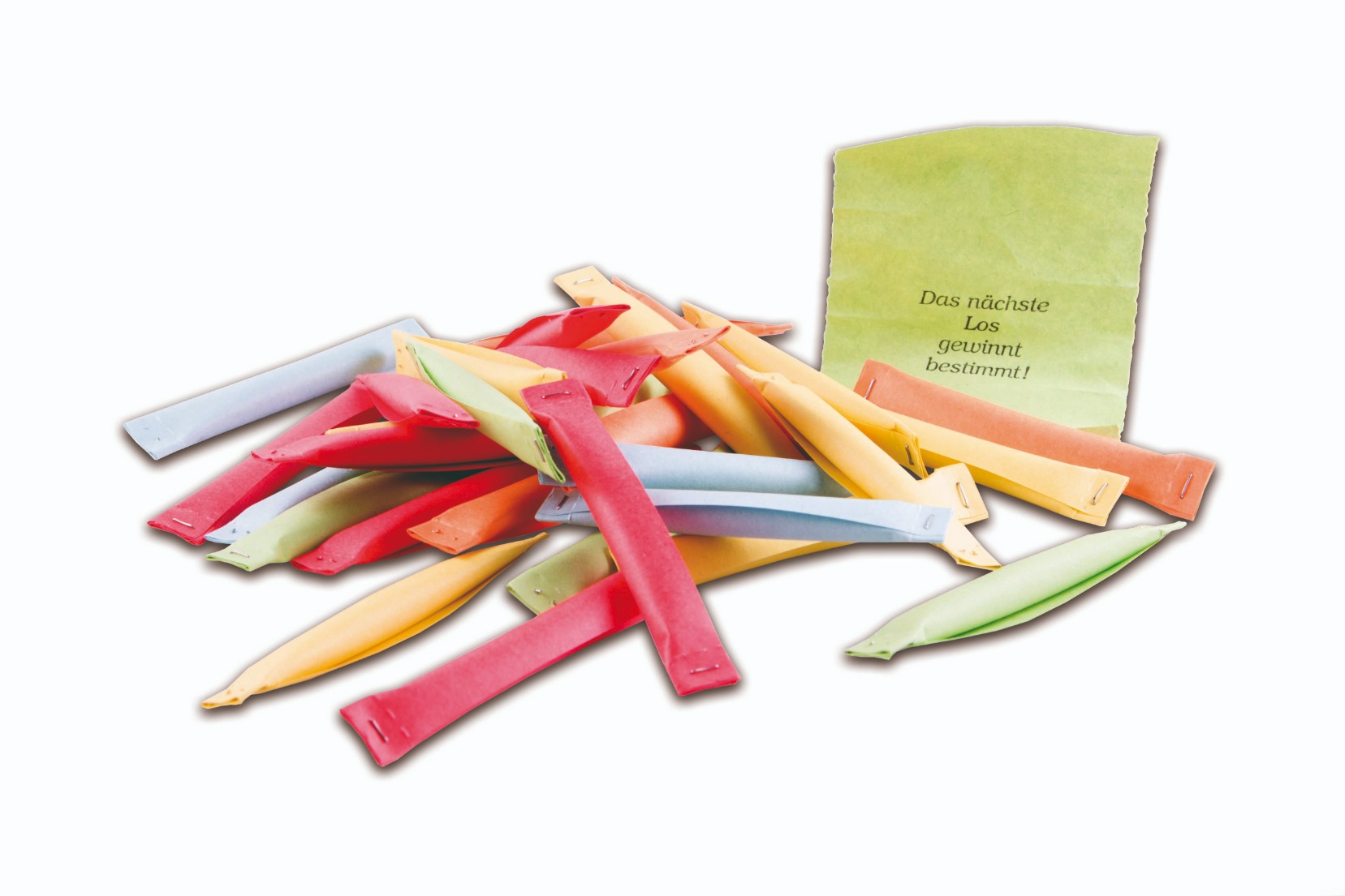 Die Lose haben offen ein Format von 30 x 47 mm oder 50 x 65 mm und werden zu 100 oder 500 Stück im Beutel geliefert.