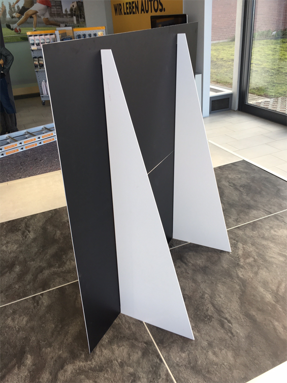 Ab einem Mindestformat von 10 cm x 10 cm kann die Größe frei gewählt werden, dabei wird entweder auf Format oder auf Kontur geschnitten, sodass auch andere Formen als viereckig möglich sind. Die Platten bestehen aus weißem Hartschaum mit einer Dicke von 19 mm. Sie können auch mit Bohrungen erworben werden, welche das Anbringen erleichtern. Dann befinden sich in den Ecken jeweils 4 mm große Löcher. Die Platten stehen aber auch ohne vorgebohrte Löcher zur Verfügung.