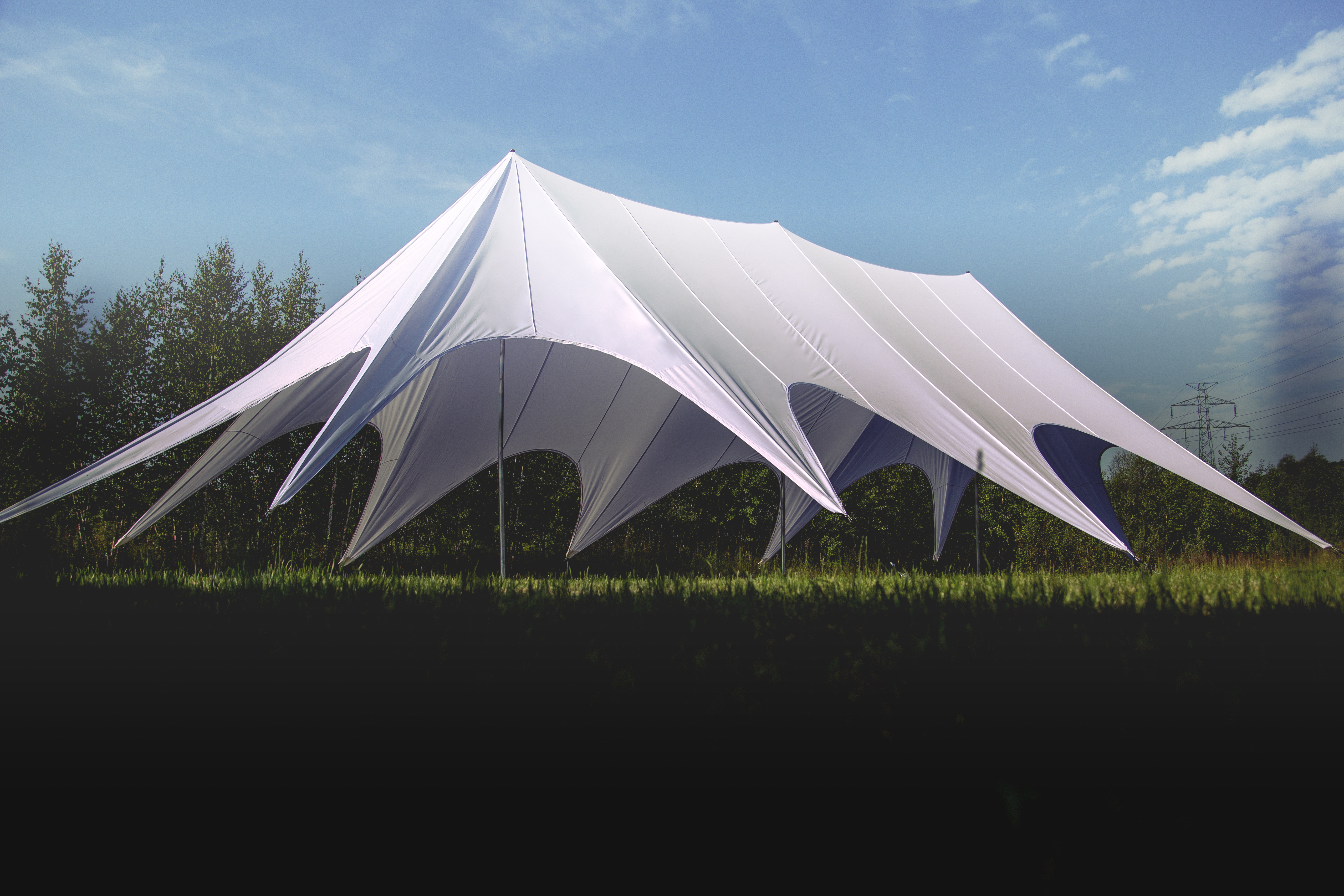 Das Dreimast-Sternzelt, auch als Triple Startent bekannt, ist die Königsklasse der mobilen Überdachungen. Mit seiner enormen Spannweite von 17,5 m erzeugt es einen außergewöhnlichen visuellen Effekt, der sowohl aus der Ferne als auch im Inneren durch ein Gefühl von Weite und Leichtigkeit besticht. Dieses Werbezelt eignet sich hervorragend für exklusive Empfänge, Konferenzen oder Premieren, bei denen Sie eine große Anzahl an Gästen unter einer stilvollen und offenen Konstruktion vereinen möchten.